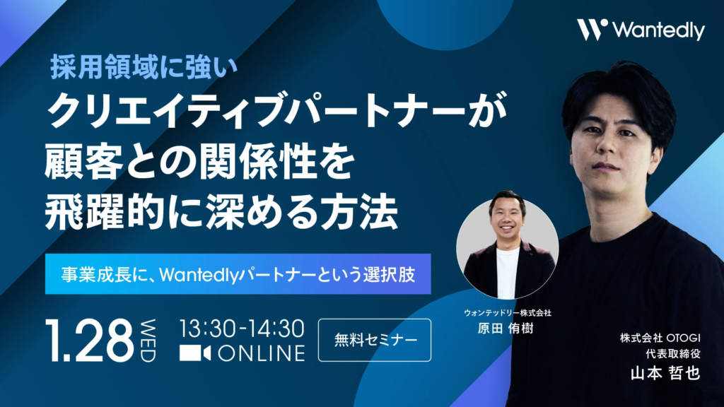 Wantedly運用代行事業のトップパートナーであり、Wantedly販売代理でもあるOTOGIがウォンテッドリー社とパートナー様向けの共催セミナーを行います。